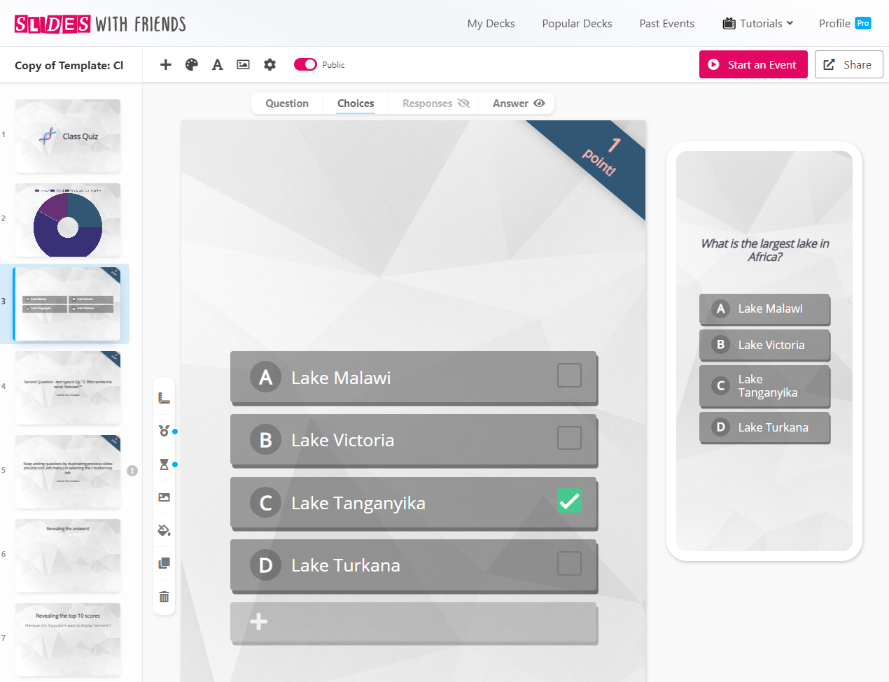 Once your quiz is complete, click the ‘Start the Event’ button in the top right-hand corner, pick your advanced options, and then launch!