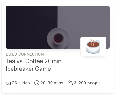 One of our favorite ways of keeping an audience engaged with questions is with this or that questions. Or, as we call them at Slides with Friends, tea vs coffee questions. Our slide deck Tea vs Coffee was created to make engaging with big groups easier, but still fun.