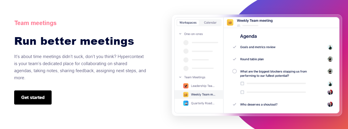 One tool we recommend for setting clear agendas is HyperContext. The interactive meeting tool allows you to easily assign next steps and keep track of meeting progress. And as an added bonus, your team can share feedback right there in their workspace.