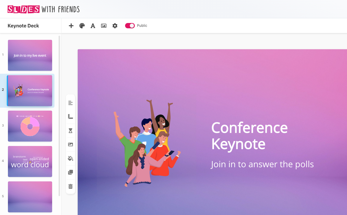 Build your conference presentation like a slide deck (or just pick from our ready-to-play icebreakers and group polling decks below). Add special interactions like live polls, quiz questions, word clouds, and more, as new slides.