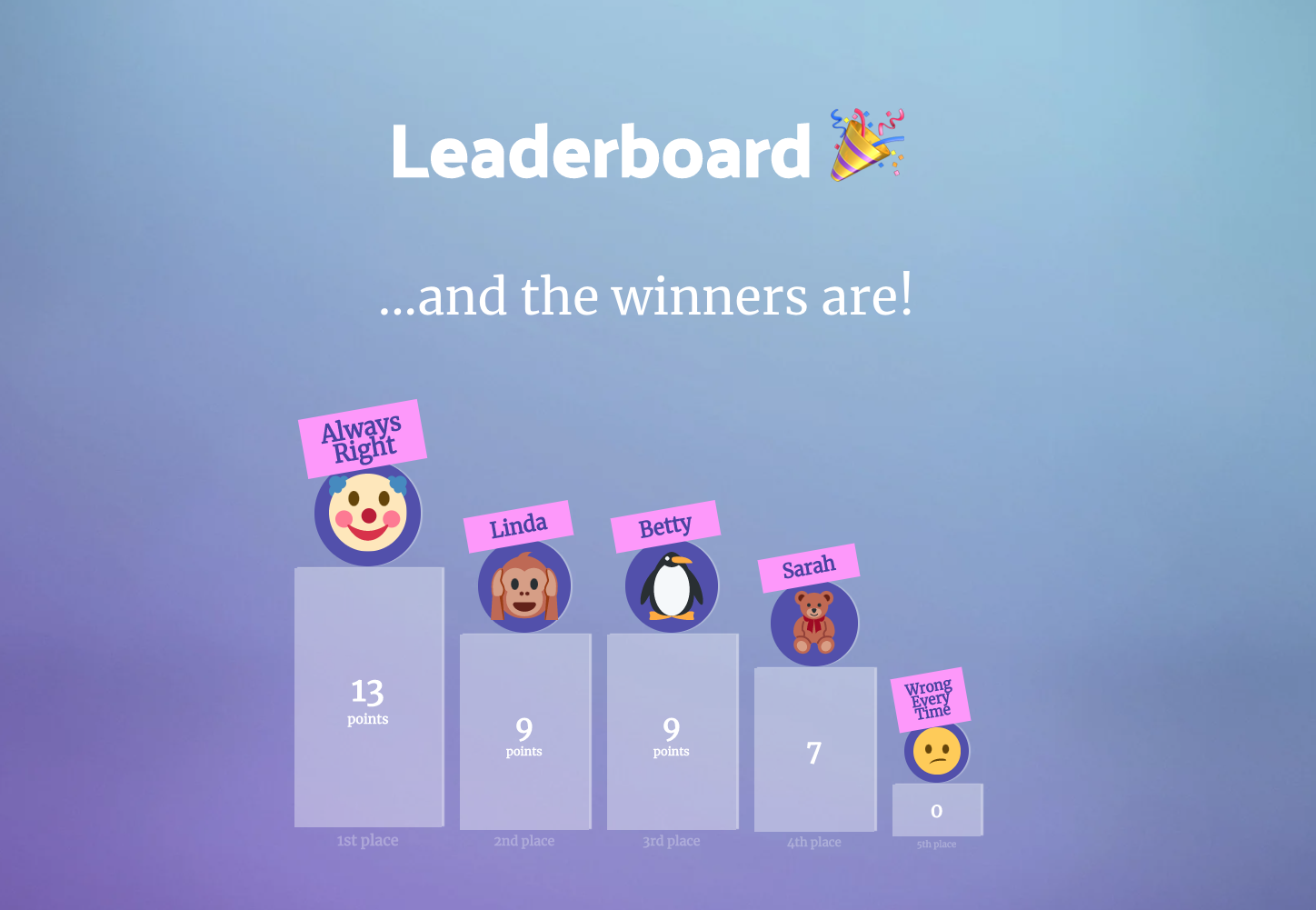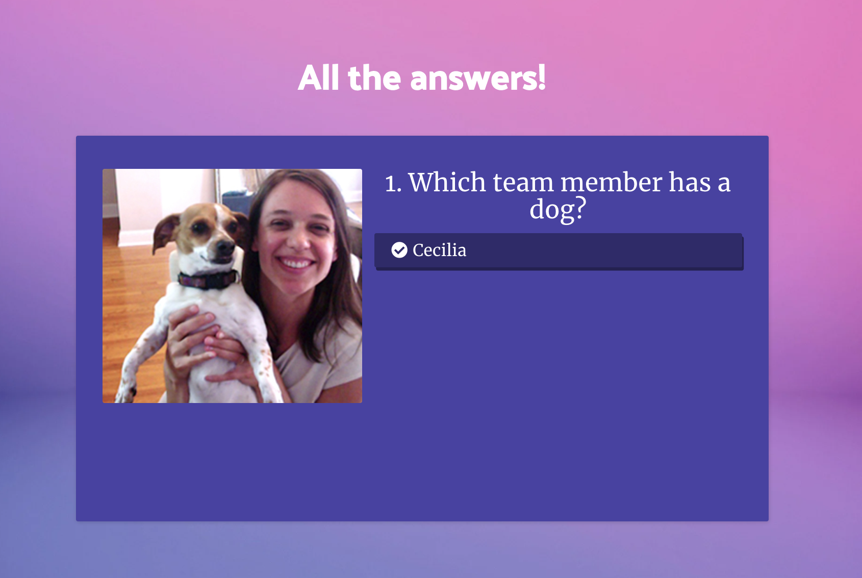 Build your own immersive quizzes and trivia events, all in a familiar slide deck interface. (Or don't do any work and just pick and play from our popular pre-made trivia games).