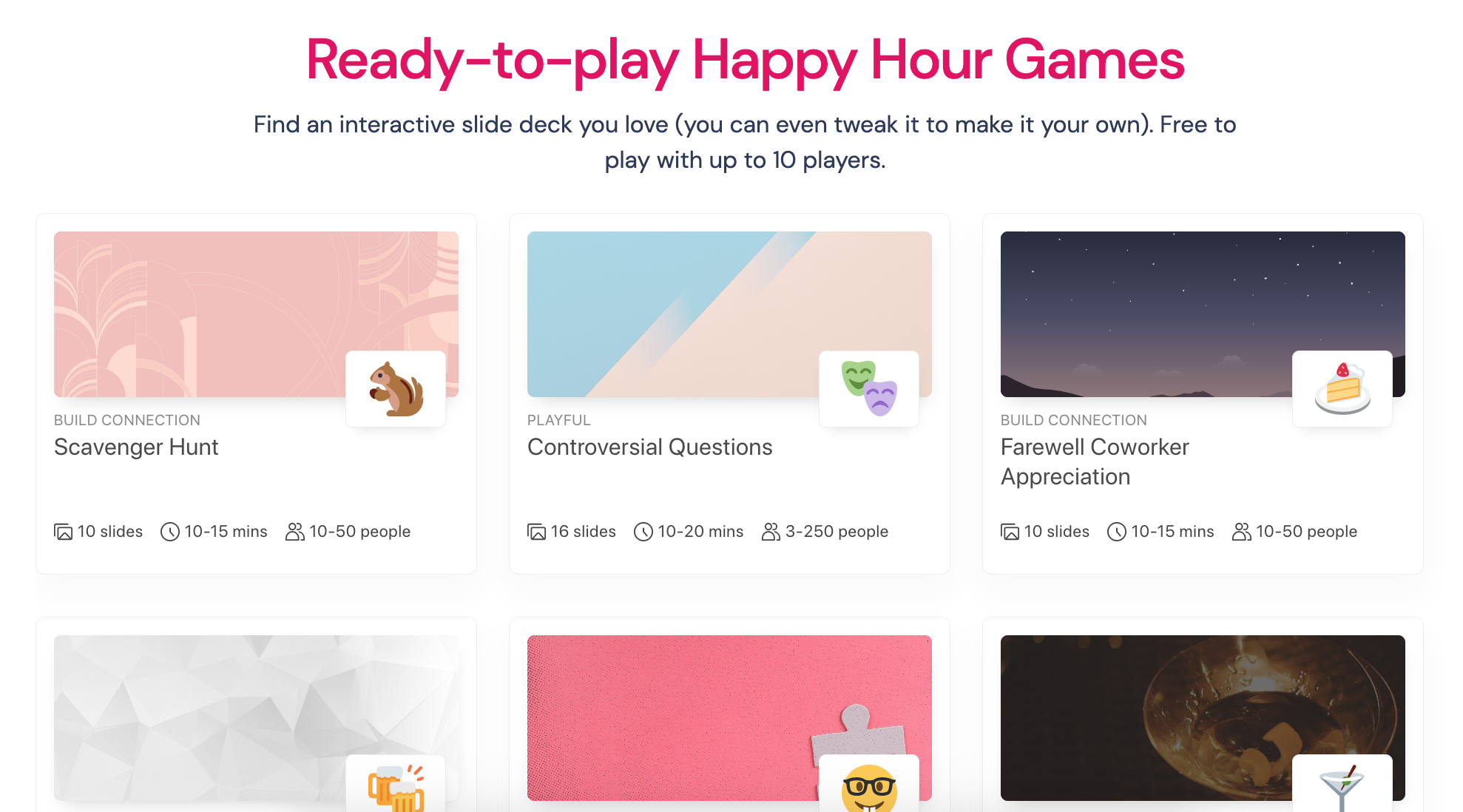 We're more than a simple interactive game player. Our mission is to help connect and excite people. With built-in playful avatars, a live soundboard, and interaction types carefully designed for positive social experiences, Slides with Friends is perfect for your next team happy hour.