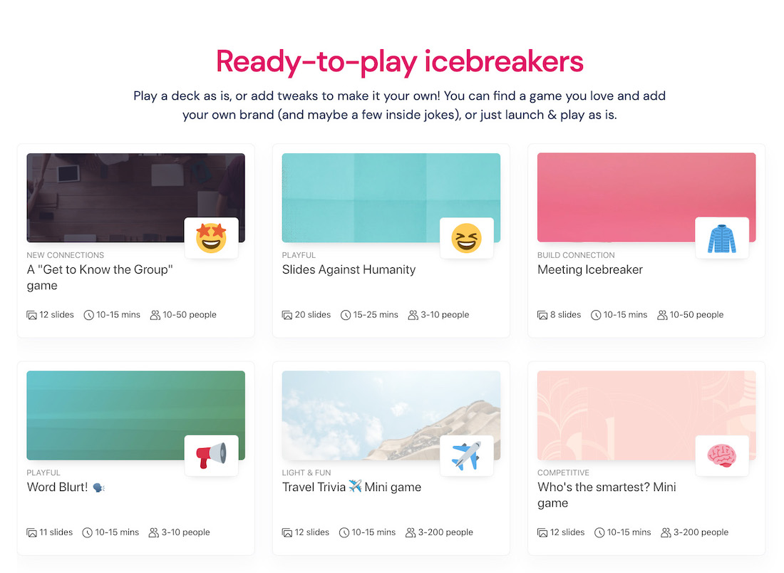 Here are some tested and loved interactive slide deck icebreaker games that you can use to create team alignment, engagement, and enjoyment.